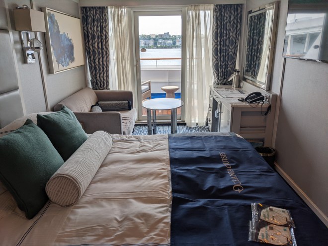As we traveled to Boston, we unpacked, explored, and met the cabin stewards. Sweetly, they agreed to move one of the pool lounges to our deck so that I could pretend I was in my chair at home. Bob has been photographing (and making friends doing so, of course), and I have endeavored (mostly unsuccessfully to figure out the internet. Bottom line: we will leave our phones in the safe, as they are completely unusable except when in a US or Canadian city. And the Internet is iffy or not at all. So, no texts, calls, etc. Maybe we can read email via Internet, but don’t be surprised if we don’t answer.