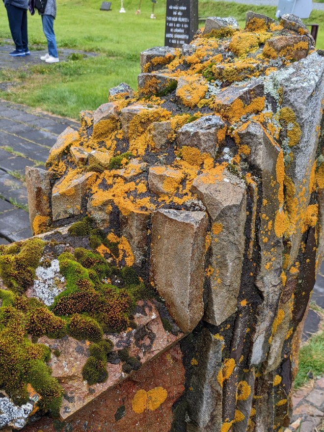 The mountains and the ground have very little soil, so very little grows. The color comes from the lichen and moss. From the Farmer’s Church, a close-up of the lichen and moss on the gatepost: