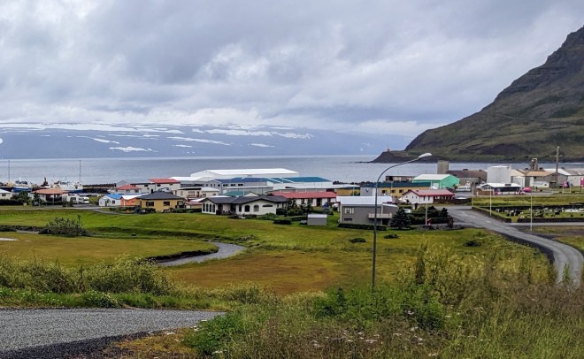 The town of Isafjordur is equally barren, as I reported in the last post. Houses, corporate buildings, lumber supply all squished together. You will note the total absence of trees and bushes, adding to the sense of hardness.