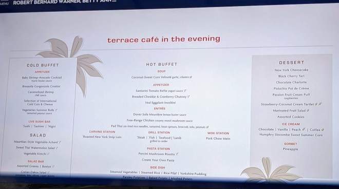 Before I close this “Transatlantic Treasurers” portion of the blog, it seems fitting to comment on Oceania’s food service, especially as Oceania markets themselves as the culinary experts. For those who might wish details, here’s a photo of one of today’s menus.